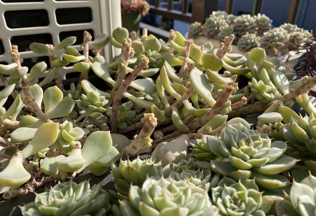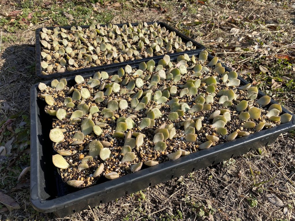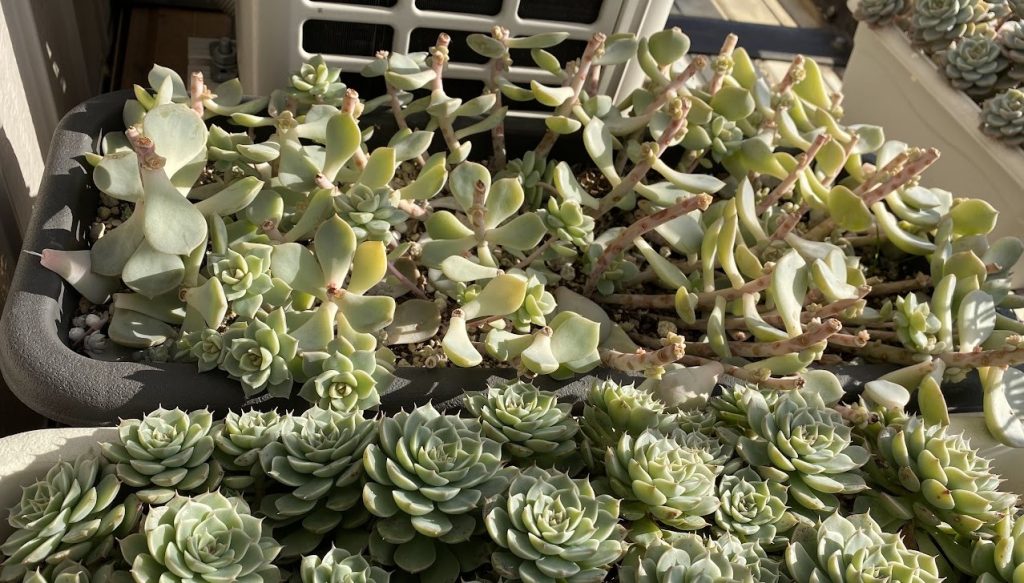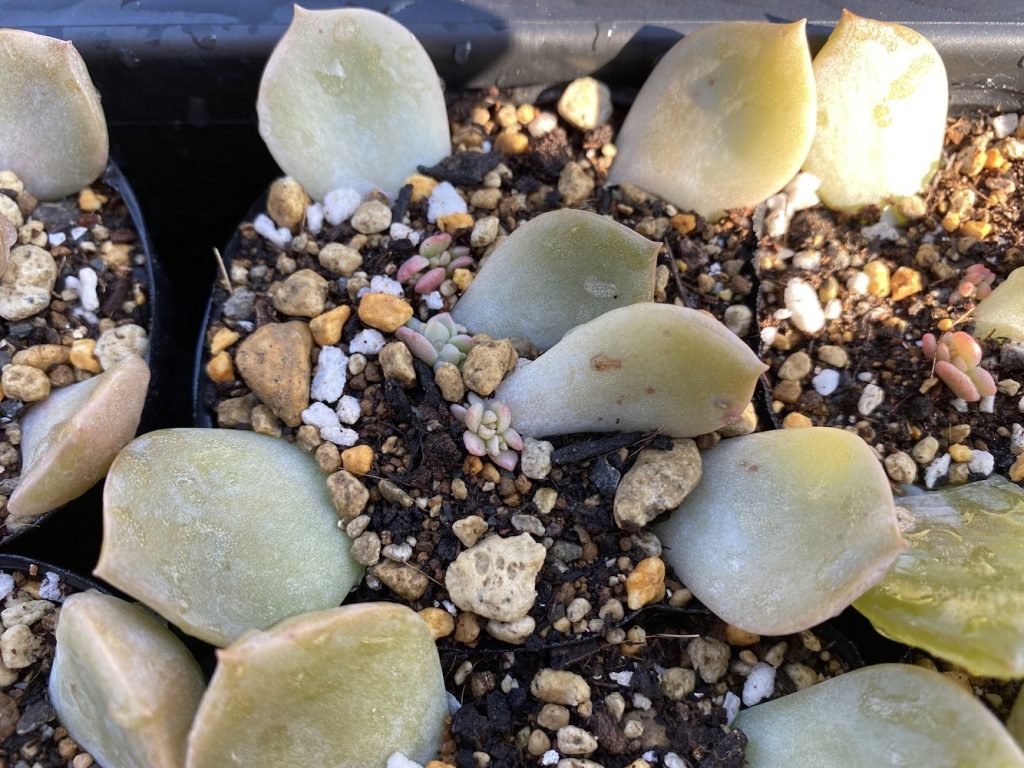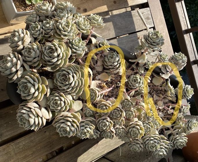 👆これは一年前に葉挿しから育てた白牡丹。黒ポットに葉挿しし、ある程度成長したところでプランターに植え替えベランダで育ててきたものです。なるべく雨に当たらない場所で風通しもよく乾燥気味に管理してきました。